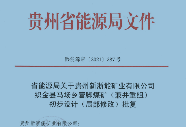 贵州新浙能矿业有限公司 织金县马场乡营脚煤矿(兼并重组) 初步设计(局部修改)