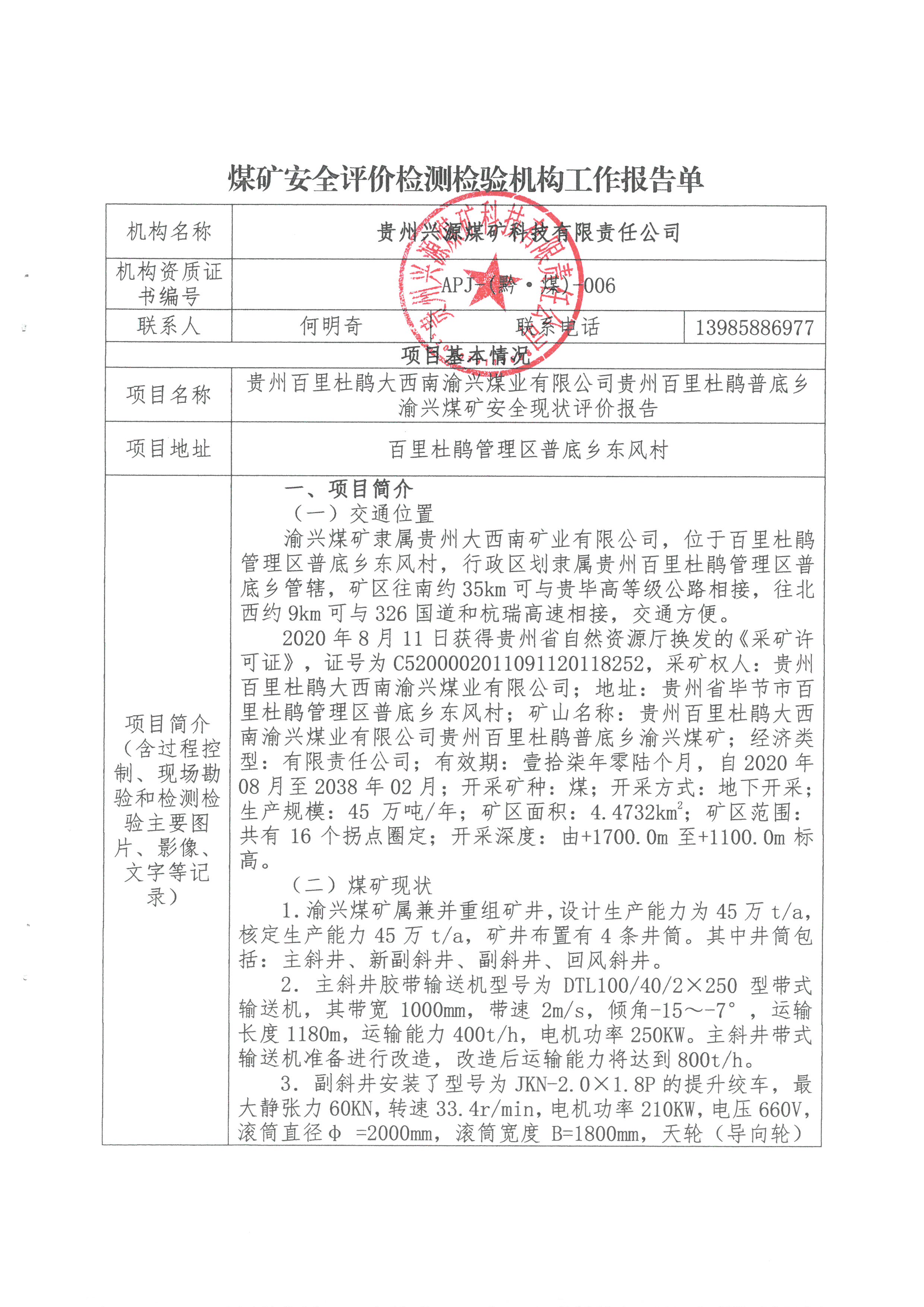 煤矿安全评价检测检验机构工作报告单【贵州省黔西县兴鳌矿业有限公司黔西县观音洞镇高坡煤矿安全现状评价】