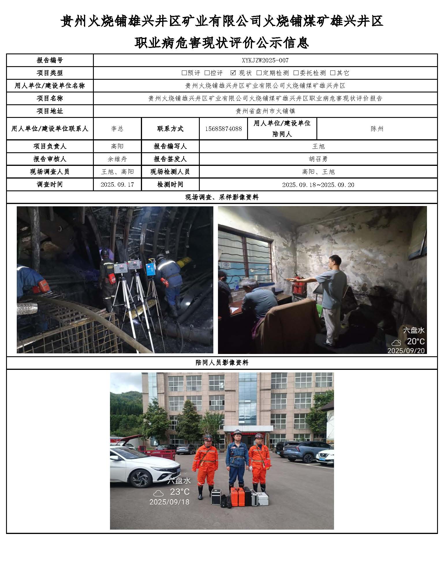 贵州火烧铺雄兴井区矿业有限公司火烧铺煤矿雄兴井区职业病危害现状评价公示信息