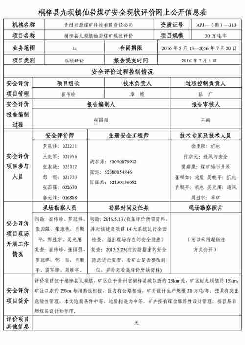 桐梓县九坝镇仙岩煤矿安全现状评价网上公开信息表