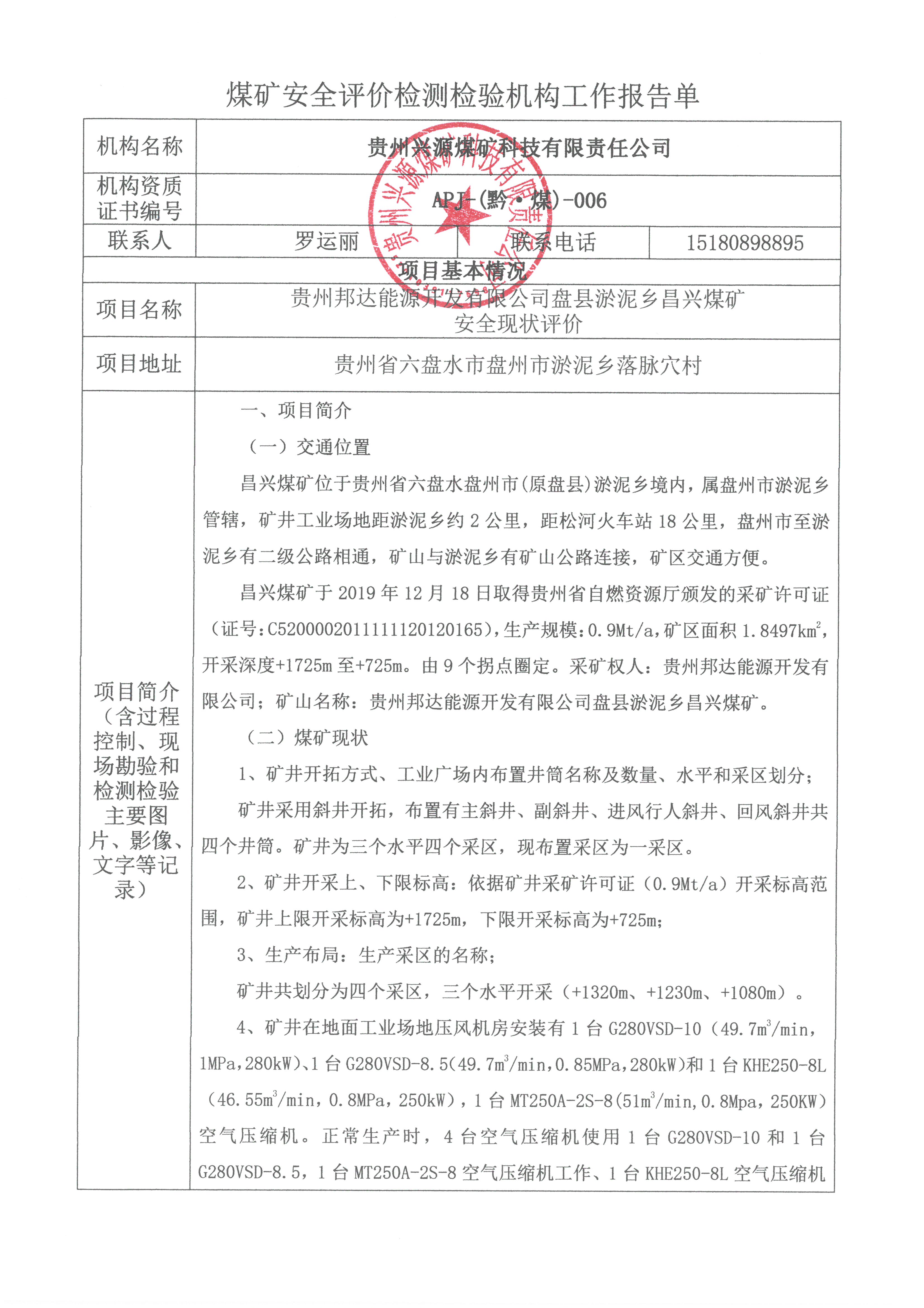 煤矿安全评价检测检验机构工作报告单【贵州邦达能源开发有限公司盘县淤泥乡昌兴煤矿安全现状评价】