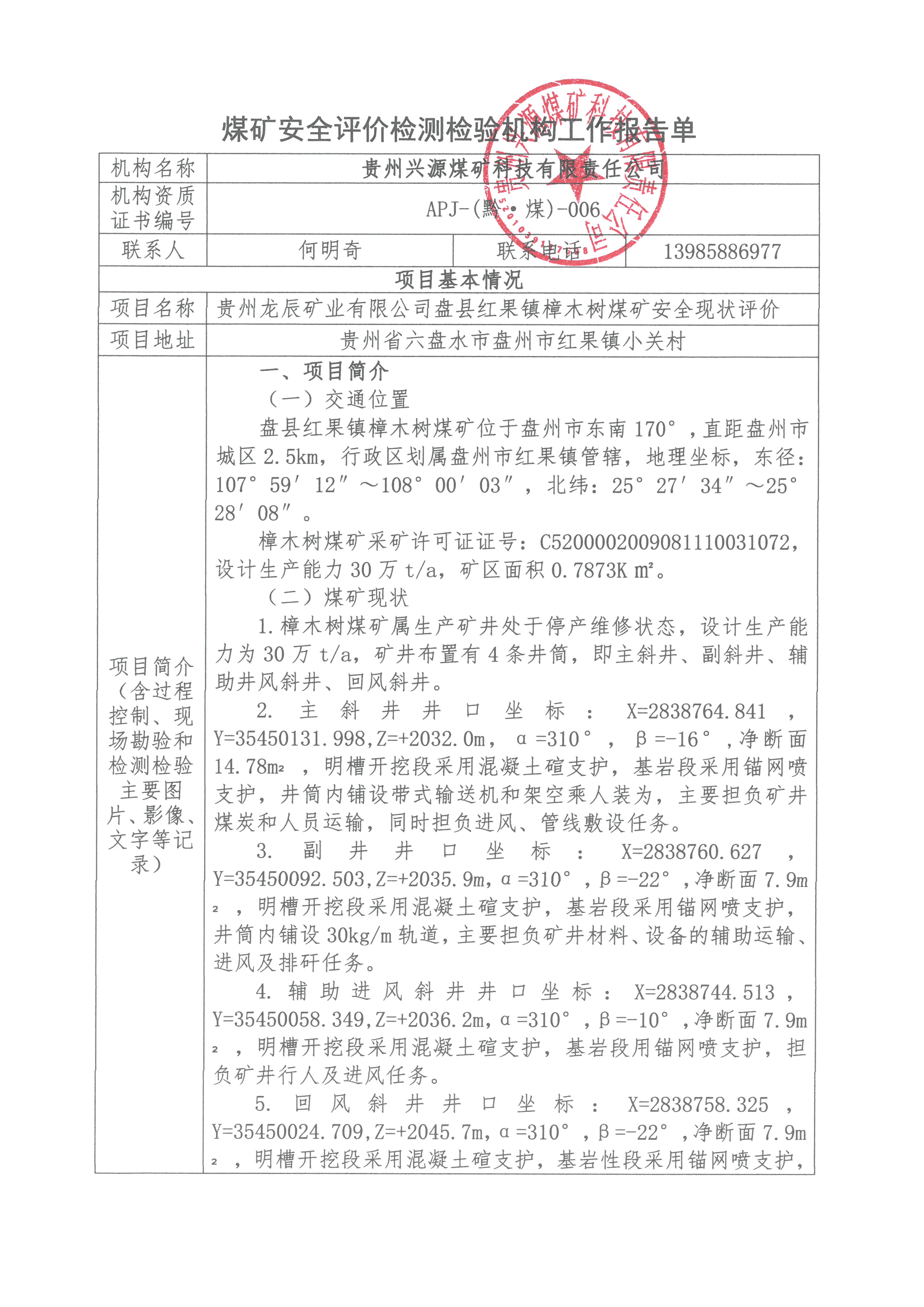煤矿安全评价检测检验机构工作报告单【贵州龙辰矿业有限公司盘县红果镇樟木树煤矿安全现状评价】