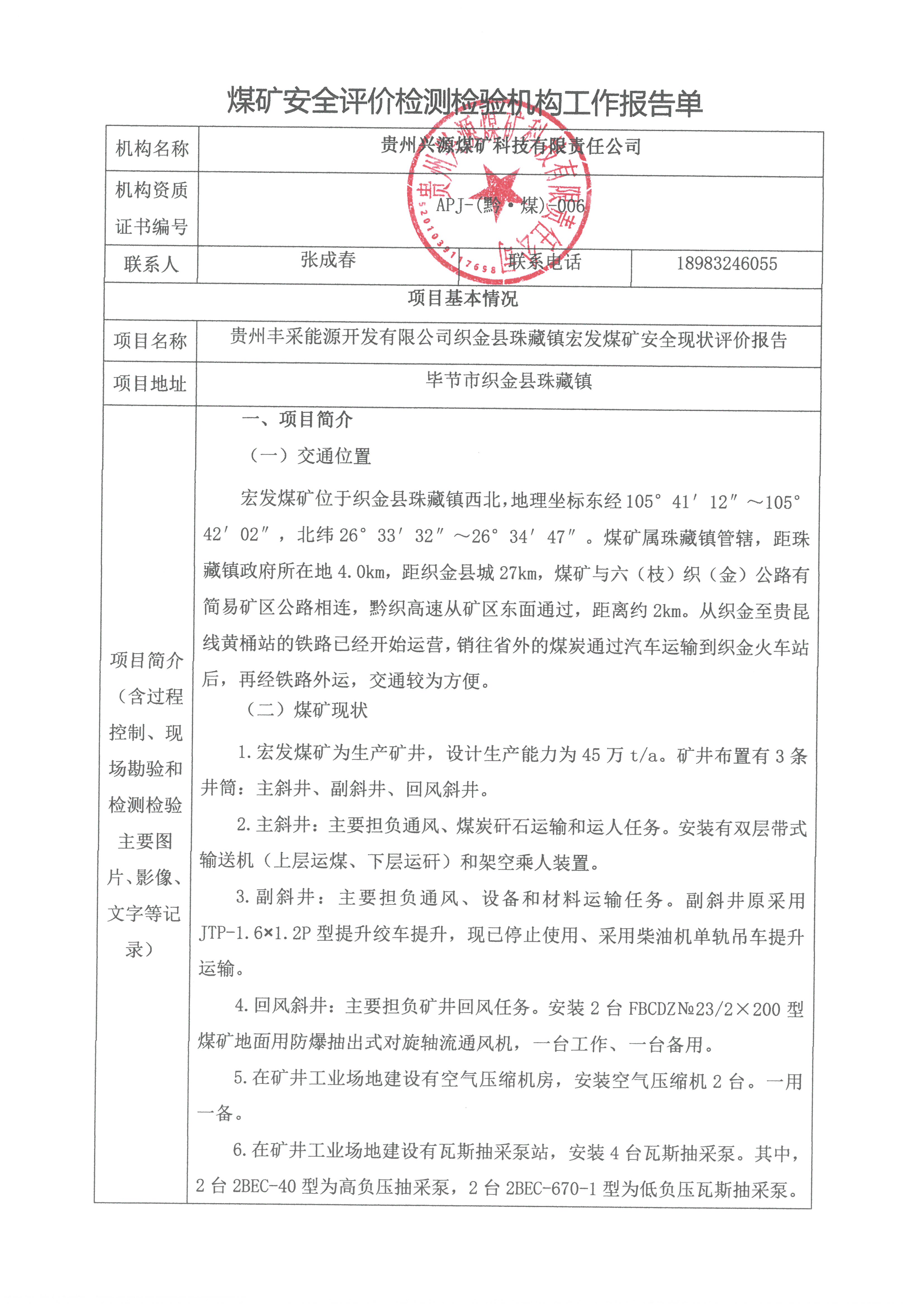 煤矿安全评价检测检验机构工作报告单【贵州丰采能源开发有限公司织金县珠藏镇宏发煤矿安全现状评价报告】